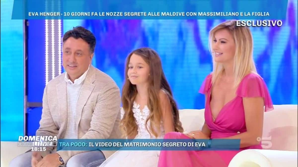 Eva Henger ha sposato il suo Massi alle Maldive. Per celebrare i quindici anni insieme l’ex naufraga ha fatto le seconde nozze lontano dall’Italia per festeggiare il legame con il compagno e celebrare l’unione della sua famiglia. All’evento erano però assenti i suoi due figli più grandi perché impegnati a lavorare a Roma. Le immagini in esclusiva sono andate in onda a Domenica Live, durante l’ultima puntata del contenitore di Canale 5 condotto da Barbara d’Urso. Grazie alla conduttrice, però, Mercedesz è comunque riuscita a fare alla madre una bellissima sorpresa arrivando in studio con il suo abito nuziale.