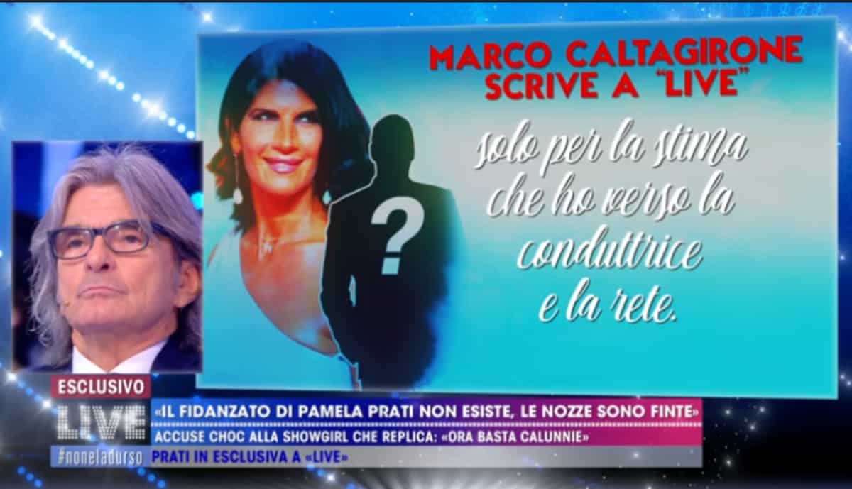 Chi è Marco Caltagirone? Il giallo del misterioso “fidanzato” di Pamela Prati si infittisce, anche grazie alla lettera che l’uomo ha scritto per Live – Non è la D’Urso. Di Marco o Mark (qual è il nome preciso?) pare non esistano tante foto e, anche per questa assenza, almeno momentanea, di immagini, c’è chi sospetta che l’annunciato “matrimonio” con la Prati sia “finto”. Ecco il video Mediaset con la versione di Caltagirone, trasmessa a Live nella puntata di oggi, mercoledì 10 aprile 2019.